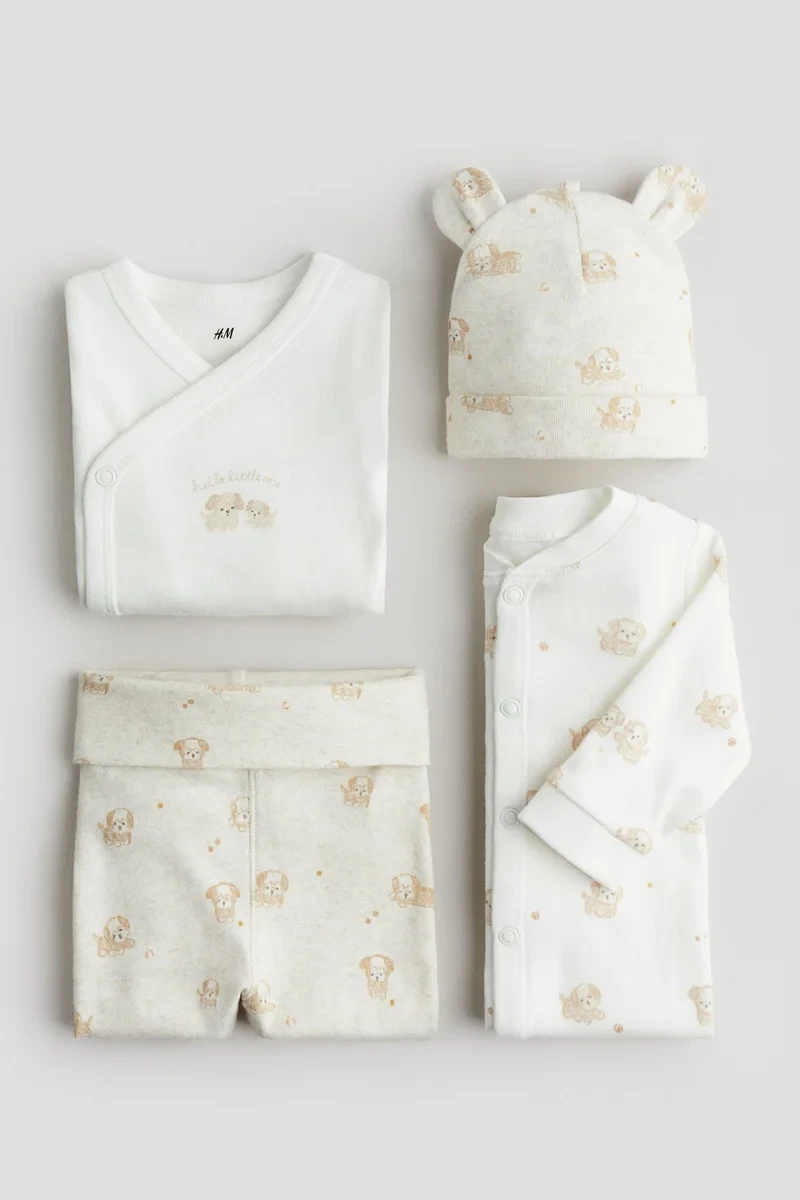 Gift set in soft, printed cotton jersey with a romper suit, bodysuit and pair of trousers featuring a matching beanie. Long-sleeved romper suit with press-studs down the front that continue down one leg, and full feet with soft elastication at the back. Long-sleeved bodysuit with a wrapover front and press-studs at the sides and bottom for easy changing. Gathered seams around the legs for a more comfortable and snug fit around the nappy. Trousers with a wide, foldover waist and full feet with soft elastication at the back. Beanie with a knot on the top and a turn-up at the hem.